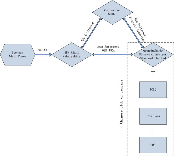 One more issue also shows SCMEC’s attitude towards the client’s cares, as well as its internationally broad eye-view and ability. The Tiroda project financing was originally from Indian local bank/financial institution with high interest rate. SCMEC made the suggestion to and subsequently assisted ADANI to successfully receive a syndicated loan from China when project came to some milestone point to replace balance amount of the original loan. This swap is a 750M USD deal, thus greatly saved a huge sum of money for the client. Following chart simply illustrates the loan picture.